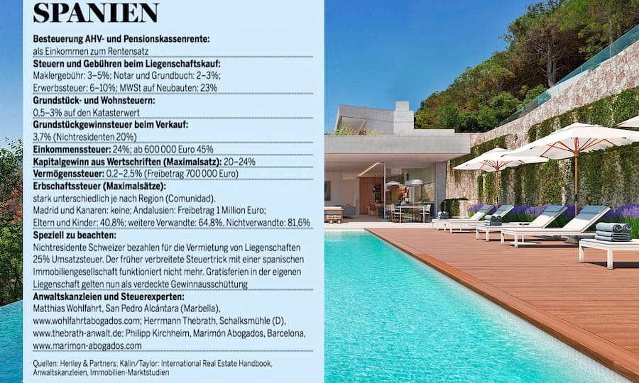 Doch auch dann unterstehen die Erben der Erbschaftssteuer im Wohnsitzland des Verstorbenen. Und das kann teuer werden. Besonders in Frankreich und Spanien langt der Fiskus kräftig zu. Frankreich besteuert bei dort verstorbenen Residenten seit der Aufkündigung des DBA sogar deren Liegenschaften in der Schweiz. Da ist es ein schwacher Trost, dass die bereits in der Schweiz abgeführte Erbschaftssteuer in Abzug gebracht werden darf.