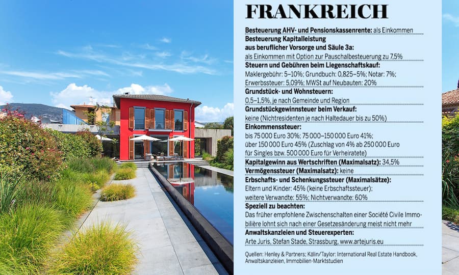 Kapitalleistungen aus der Schweizer Altersvorsorge − nebst der Pensionskasse also auch aus Freizügigkeit oder aus der Säule 3a − sind meist auch am neuen Wohnsitz steuerpflichtig. So belegt Kroatien beispielsweise Kapitalleistungen aus der Schweizer Vorsorge mit zwölf Prozent Steuern. «Das ist der gleiche Satz, mit dem Kroatien auch Kapitalgewinne und -erträge aus dem Ausland belastet», weiss Mia Jug-Dujakovic´, Rechtsanwältin und Steuerexpertin in Split. In Frankreich besteht dagegen die Wahl, sie auf Grundlage der normalen Einkommenssteuersätze zu versteuern oder mit einer Pauschalsteuer von 7,5 Prozent − «was meist günstiger ist», wie Steueranwalt Stefan Stade aus Strassburg weiss.