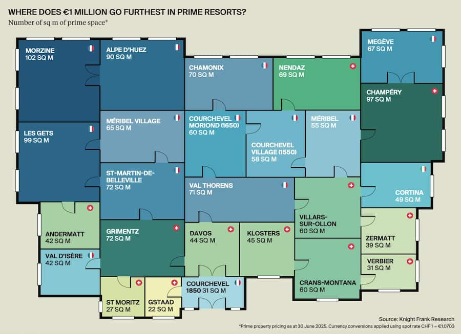 In der Analyse wurde auch ausgewertet, wie viel Wohnfläche du in den jeweiligen Orten für eine Million Euro (umgerechnet 913'150 Franken) bekommst. Wo es in vielen französischen Bergorten noch etwa eine Drei-Zimmer-Wohnung gibt, ist es in manchen noblen Schweizer Skiorten gerade mal eine geräumige Besenkammer. In Gstaad BE bekommt man für diese Summe nämlich bloss 22 Quadratmeter.