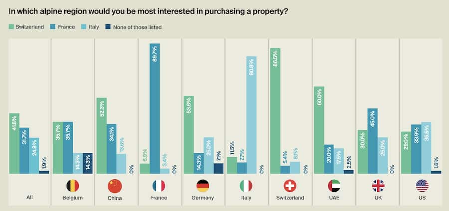 Unter anderem wurden diese gefragt, in welchem Land sie am ehesten eine Immobilie in den Bergen kaufen würden. Die Präferenzen variieren je nach Herkunft stark: So sind Interessenten aus den Vereinigten Arabischen Emiraten und China mit grosser Mehrheit an Liegenschaften in den Schweizer Alpen interessiert. 60 Prozent aus den Emiraten geben an, eine hiesige Berg-Immobilie kaufen zu wollen. In China sind es mit 52,3 Prozent ebenfalls mehr als die Hälfte. Auch die Deutschen bevorzugen ein Ferienhaus in der Schweiz gegenüber einer Immobilie in Frankreich oder Italien.