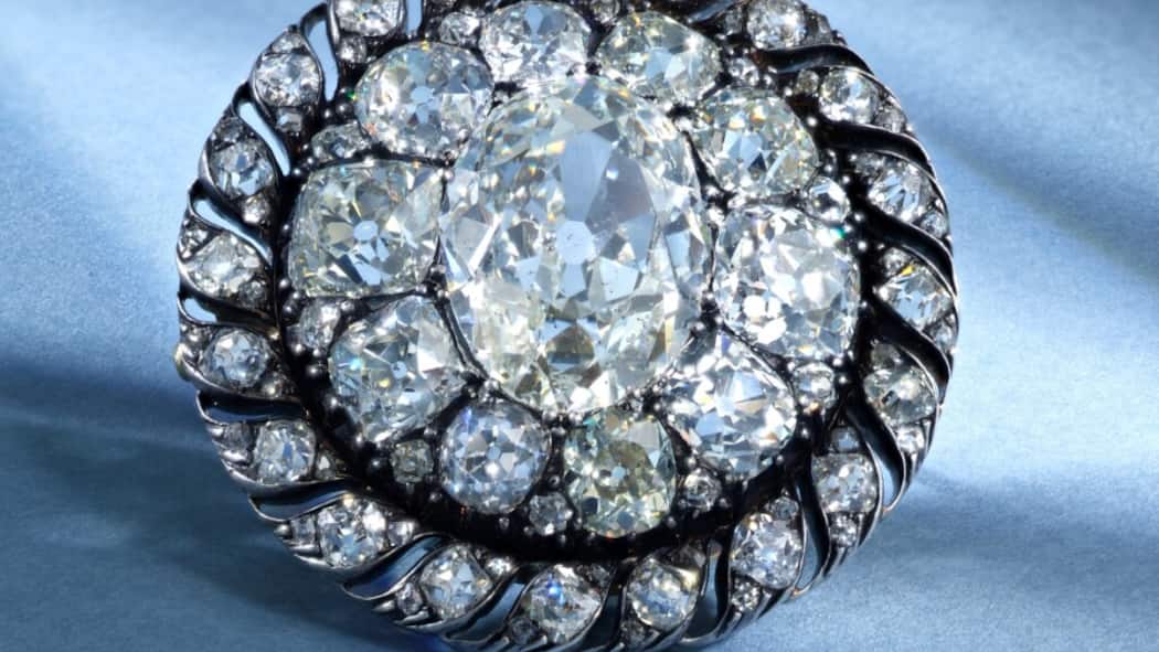 Die runde Brosche mit einem Durchmesser von etwa 45 Millimeter hat in ihrer Mitte einen grossen ovalen Diamanten mit einem Gewicht von 13,04 Karat, der von zahlreichen weiteren Diamanten im Minenschliff umgeben ist. Das Schmuckstück ist mit einem Schätzpreis von 120'000 bis 200'000 Franken bewertet.
