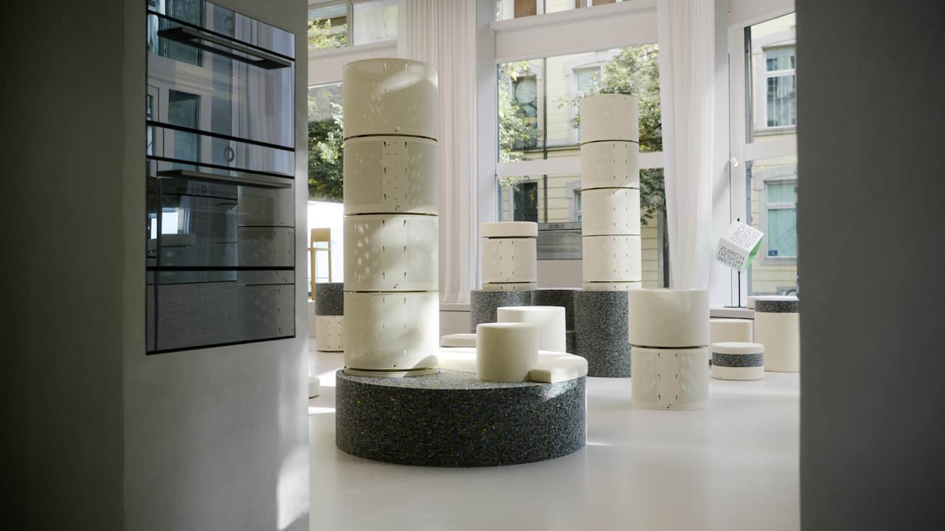 An den Zurich Design Weeks Anfang September präsentierte V-Zug die Installation «Continuum». Die in Zusammenarbeit mit Fischbacher 1819 und Bureau konzipierte Ausstellung zeigte zirkuläres Design für eine nachhaltige Zukunft. Oder um es weniger abstrakt zu beschreiben: Die Besucher erwartete ein Kunstwerk aus recycelten Materialien wie Verbundschäumen, rekonstituierten Textilien und mechanischen Teilen von Haushaltsgeräten. Im Zentrum der Installation standen recycelte Edelstahlwaschtrommeln von V-Zug-Geräten, die neu als Raummodule interpretiert wurden. Ziel der Ausstellung war, Zirkularität zu präsentieren und die vielfältigen Möglichkeiten aufzuzeigen, die Wiederverwertung mit sich bringen kann.