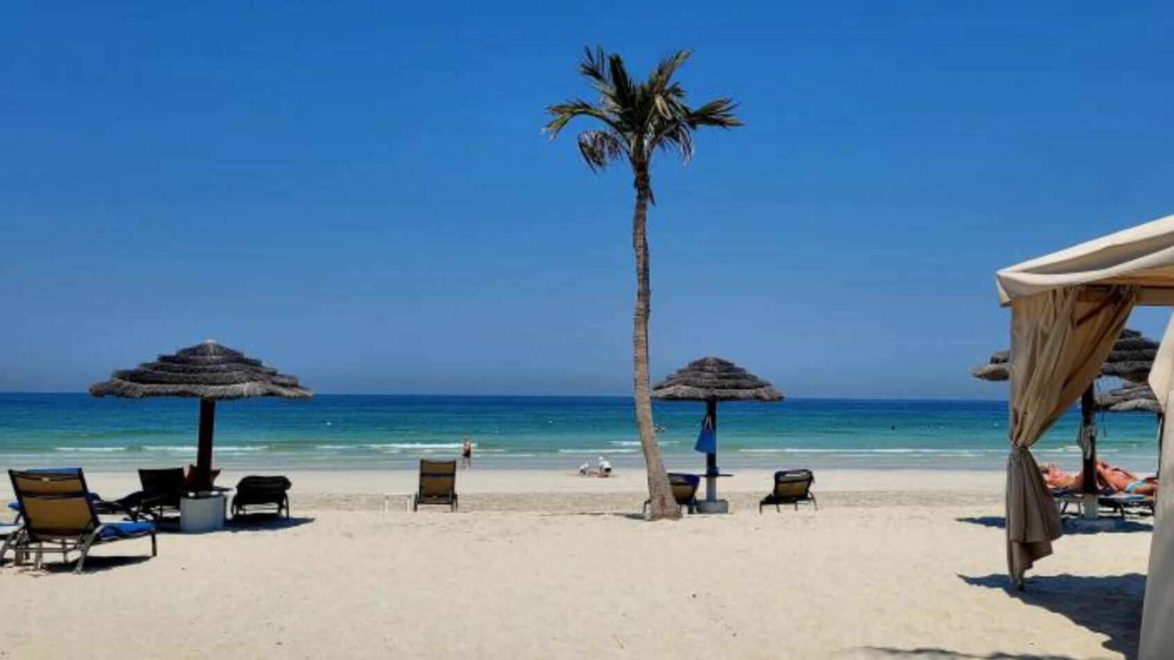 Fernab von Verkehr und Massentourismus, am Ende einer kleinen Halbinsel, befindet sich ein 400 Meter langer weisser Sandstrand. Einerseits dient er exklusiv den Gästen des Adschman Hotels und anderseits als perfektes Sujet, das über die sozialen Medien schon tausendmal in die Welt verschickt wurde. Die Aussicht auf den Golf von Arabien, öfter Persischer Golf genannt, ist spektakulär vereinfacht: Meer, Wellen und Himmel, eingerahmt von Palmen und Sonnenschirmen.