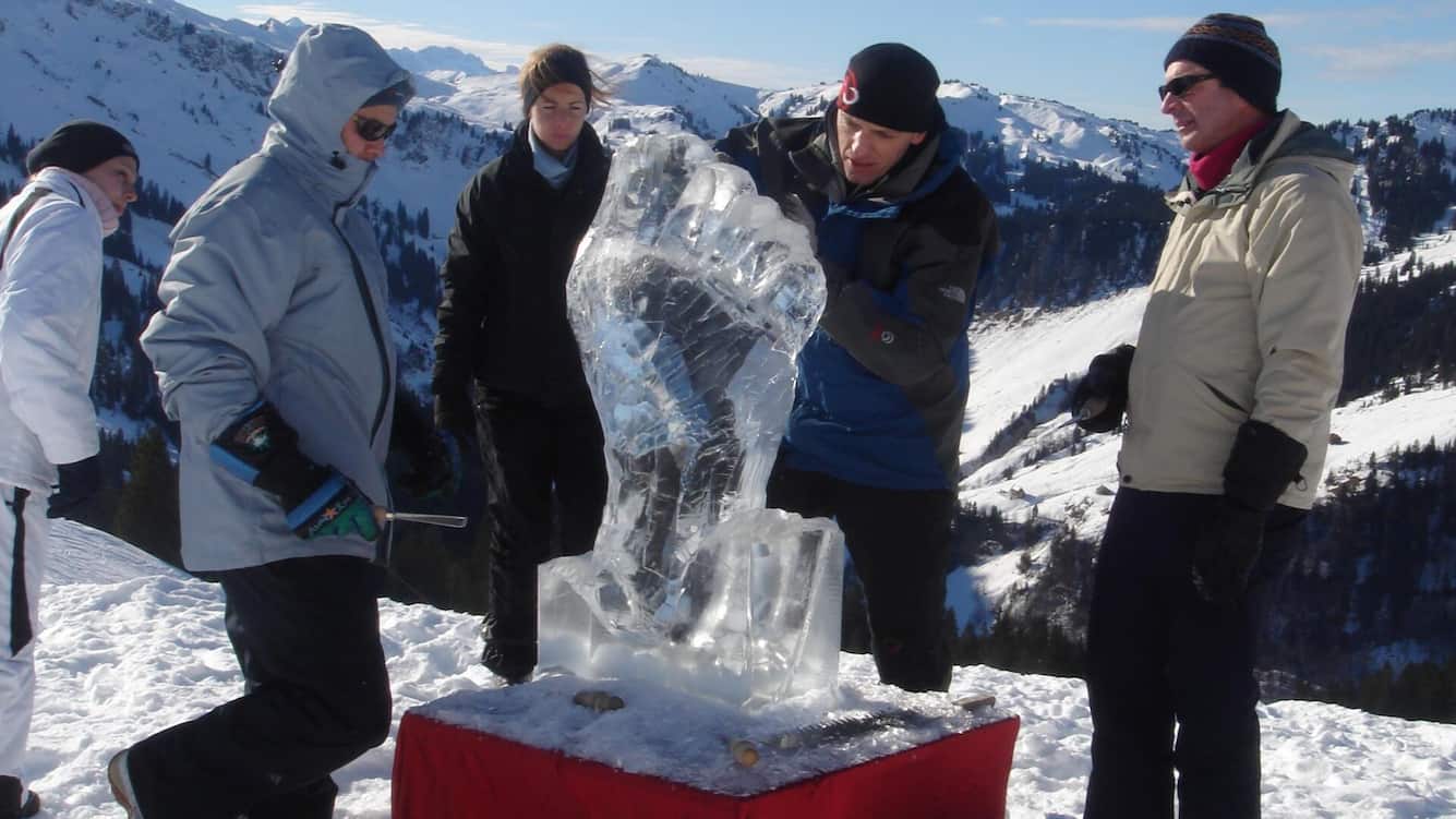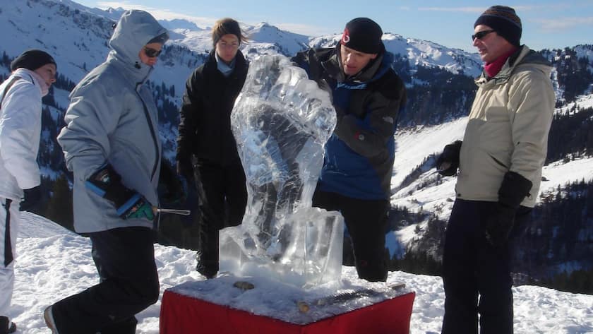 Das Teamgefühl kann man verbessern oder festigen, wenn man zusammen etwas baut. Das auf dem Bürgenstock angebotene Team-Eisschnitzen passt perfekt dazu. Es braucht keine speziellen Kenntnisse, es benötigt keine lange Einarbeitungstheorie, und alle können in kleinen Teams mitmachen. Jedes Team erhält einen 100 mal 50 mal 25 Zentimeter grossen Eisblock und kreiert dann, je nach Aufgabenstellung, eine Fantasiestruktur oder eine Skulptur mit einem spezifischen Sujet. Mit kreativen Ideen im Kopf und geschickten Händen im Einsatz steigert jedes Team den Spassfaktor und stimuliert so das Wir-Gefühl.