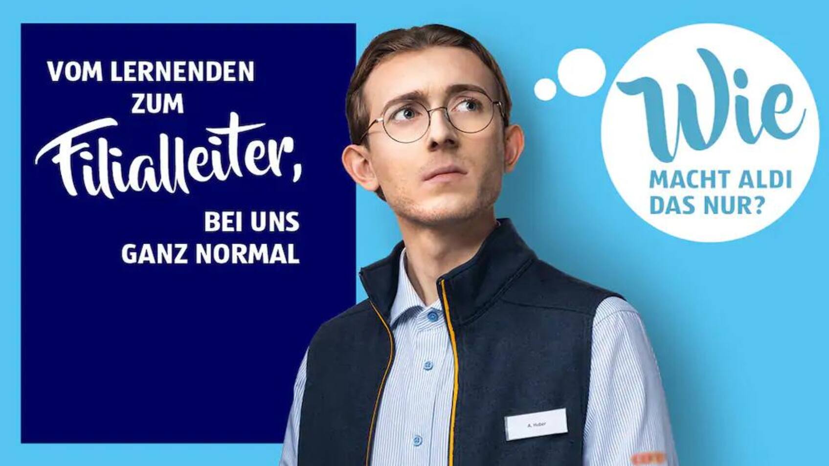 «Vom Lernenden zum Filialleiter, bei uns ganz normal» heisst es auf einem Inserat. Bebildert ist es mit einem jungen Coop-Verkäufer, dessen Logo am Hemd nur ganz schwach per Photoshop verwischt ist. Er fragt sich in einer Gedankenblase: «Wie macht Aldi das nur?» und schaut in die Luft.