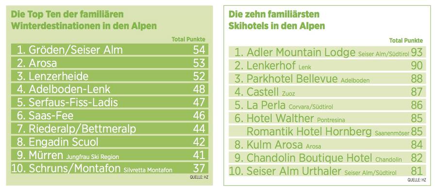 Vorjahressieger Arosa landet auf dem zweiten Platz, auf der anderen Seite der Urdenbahn macht Lenzerheide (Rang 3) zwei Ränge gut. Zusammen bilden die beiden Skiregionen einen Wintererlebnispark, in dem Familien mit unterschiedlichen Bedürfnissen besonders gut aufgehoben sind. Mit dem komfortablen Skigebiet-Übergang von der Ost- zur Westseite der beiden Lenzerheidner Talseiten und der Verbindung nach Arosa offenbart sich den Besuchern eine in Graubünden einmalige landschaftliche Abwechslung – von hochalpin (Rothorn) bis romantisch (Stätzerhorn-/Scalottas-Seite und Arosa). Ebenfalls attraktiv: Die kostenlosen Skiübungs- und Einführungsplätze in den drei «Kinderländern» – üblicherweise bezahlen die Gäste dafür oder müssen Schüler einer Schweizer Skischule sein.