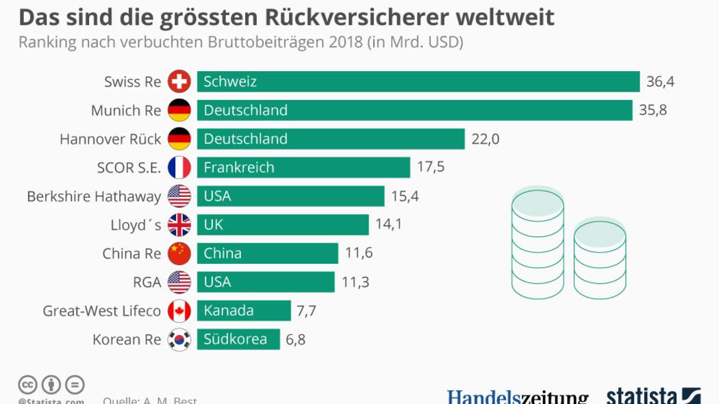 Swiss Re mit Hauptsitz in Zürich ist mit 36,4 Milliarden Dollar verbuchten Bruttobeiträgen im Jahr 2018 der grösste Rückversicherer der Welt. Dicht dahinter folgt Munich Re mit Hauptsitz in München mit Bruttobeiträgen von 35,8 Milliarden Dollar, wie eine Auswertung von Statista zeigt.