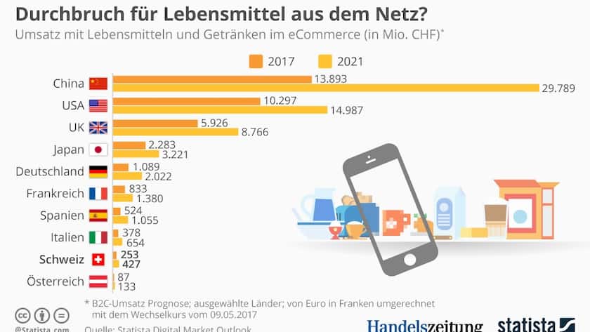 Andere Länder zeigen auf, wohin die Reise gehen könnte: In China und den USA sind Online-Lebensmittelkäufe bereits fast eine Selbstverständlichkeit. Die jährlichen Umsätze liegen heute im zweistelligen Milliardenbereich. Für China wird bis 2021 gar eine Verdoppelung auf umgerechnet fast 30 Milliarden Franken erwartet.